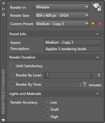 - Render By Level. Specifies the number of levels, or iterations, the render engine performs to create the rendered image. (RENDERLEVEL system variable)