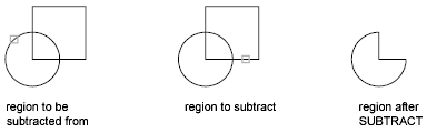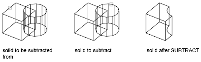 With SUBTRACT, you can create a 3D solid by subtracting one set of existing 3D solids from another, overlapping set. You can create a 2D region object by subtracting one set of existing region objects from another, overlapping set.