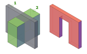 Objects in the second selection set are subtracted from objects in the first selection set. A single new 3D solid or surface is created.