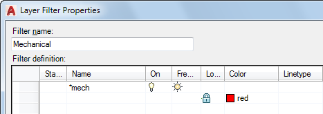 Displays the properties of layers that determine which layers are listed. You can click to specify one or more properties to define the filter. All the properties specified on a single line in the filter definition must be true to display a layer name (a logical AND). Subsequent lines in the filter definition each specify alternative criteria (a logical OR).
