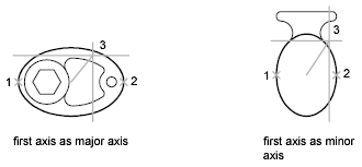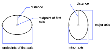 The illustrations below show two different ellipses created by specifying axis and distance. The third point specifies only a distance and does not necessarily designate the axis endpoint.