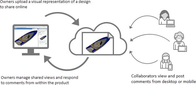 Use Shared Views to collaborate on a visual representation of your model or design online. For example, create a shared view for a customer to request approval or to provide easy access to your field sales team for on-site presentations. Using the link you provide, anyone can view, and comment on, the shared view without needing to have an Autodesk product installed. An email is sent to you when anyone comments on the shared view. You view and reply to comments and manage your shared view directly from your Autodesk product.