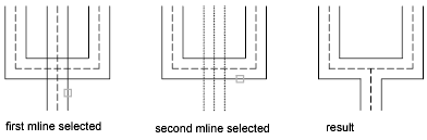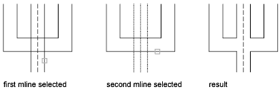 Creates a merged-cross intersection between two multilines. The order in which you select the multilines is not important.