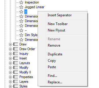 Create, edit, or remove commands using the Customize User Interface (CUI) Editor. You can also add new commands to pull-down menus, toolbars, and ribbon panels, or duplicate them to be displayed in multiple locations.