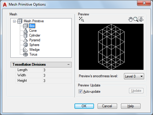 The defaults you set in the Mesh Primitive Options dialog box control the appearance of new mesh primitive objects. Mesh primitives include boxes, cones, pyramids, cylinders, spheres, wedges, and tori.