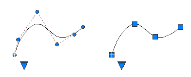 The editing options available with multifunctional grips differ depending on whether the spline is set to display control vertices or fit points. The spline on the left displays control vertices, and the one on the right displays fit points.