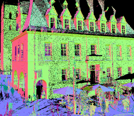 - Normal.Stylizes each point based on the normal direction of the point based on a default color scheme that is not editable. When a point cloud is captured during scanning, a normal direction vector can be calculated for each point based upon the surrounding points. In this way, scanner software infers planar or curved areas; the normal of a point is then a vector perpendicular to the inferred plane or curved surface.
