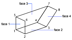 In the illustration, face 1 is defined by vertices 1, 5, 6, and 2. Face 2 is defined by vertices 1, 4, 3, and 2. Face 3 is defined by vertices 1, 4, 7, and 5, and face 4 is defined by vertices 3, 4, 7, and 8.