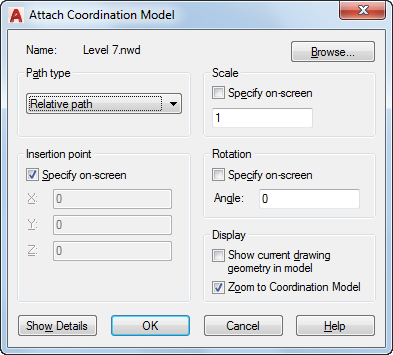 Locates, inserts, names, and defines the parameters and details of attached coordination models, such as NWD and NWC Navisworks files.