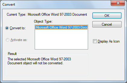 Converts the embedded object to the type specified under Object Type.