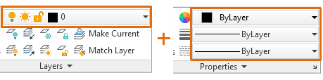 On the Home tab of the ribbon, use the Layers and Properties panels to verify or change the settings for the most commonly accessed properties: layer, color, lineweight, and linetype.