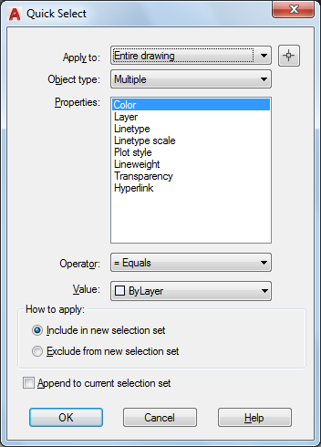 If Append to Current Selection Set is selected, the filtering criteria is applied to the entire drawing.