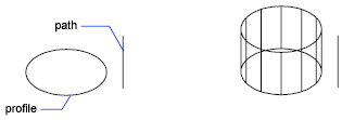 Specifies the extrusion path based on a selected object. The path is moved to the centroid of the profile. Then the profile of the selected object is extruded along the chosen path to create solids or surfaces.