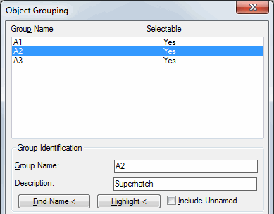 3) Select the group. Note that "superhatch" appears in the description field for groups created by SUPERHATCH.