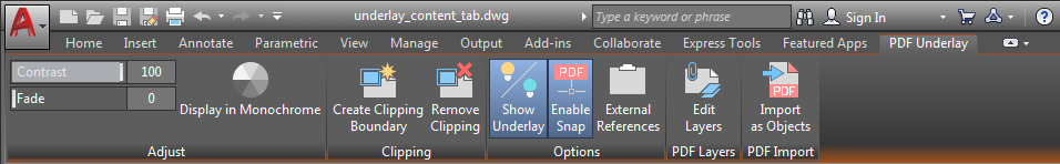 When you select a PDF underlay, the PDF Contextual tab is displayed on the ribbon.
