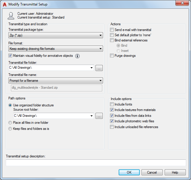 Enter a description for the transmittal setup. This description is displayed in the Create Transmittal dialog box below the list of transmittal file setups. You can select any transmittal setup in the list to display its description.