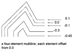 Displays all the elements in the current multiline style. Each element in the style is defined by its offset from the middle of the multiline, its color, and its linetype. Elements are always displayed in descending order of their offsets.