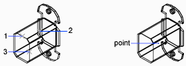 This example shows how to use coordinate filters to create a point object at the center (centroid) of a 3D object. Hidden lines have been removed for clarity. The X value of the new point is extracted from the first location specified, the Y value from the second location, and the Z value from the third. The three values are combined to form the coordinate values of the new point.