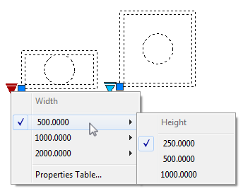 A lookup property with reverse lookup enabled adds a lookup grip to the dynamic block reference. When you click this grip, a drop-down list of that column’s lookup values is displayed. The corresponding input property values of the selected list item are assigned to the block reference.