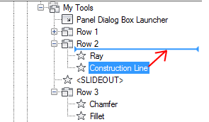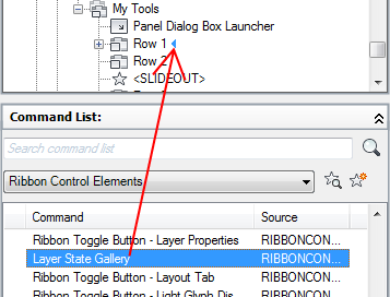 - Drag and drop a control from the Command list to a row in the ribbon panel.