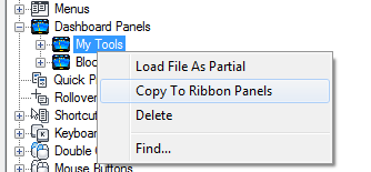 - Right-click over the dashboard panel you want to copy and convert to a ribbon panel. Click Copy to Ribbon Panels.