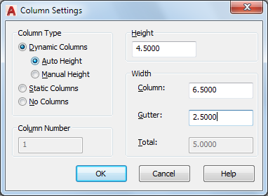 Displays and specifies control column and gutter width values. The gutter value is five times the default text text height.