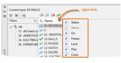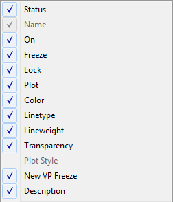 Lists all columns by name. A check mark indicates that the column is included in the display. Click a column name to display or hide the column. VP Freeze, VP Color, VP Linetype, VP Lineweight, and VP Plot Style are available only when a layout viewport is active.