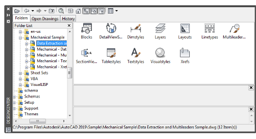 Use the tree view on the left to browse sources of content and to display content in the content area on the right. From the content area, you can add items to a drawing or to a tool palette. A preview or description is displayed for selected drawings, blocks, hatch patterns, or xrefs.
