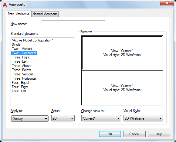 Specifies a name for the new model space viewport configuration. If you do not enter a name, the viewport configuration is applied but not saved. If a viewport configuration is not saved, it cannot be used in a layout.