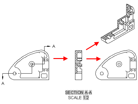 A model documentation section view is a projected view from an existing drawing view, where you use a section line to cut through the drawing view in order to reveal what is inside.