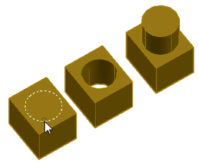 Press in or pull out bounded, or closed, areas or objects to create holes and 3D solid extrusions. You can click inside a closed object, an area, or a face that is imprinted on a solid object and then drag it in or out. The following example shows how you can press or pull a circle imprinted on the face of a solid box to create a hole or extrusion from the box.