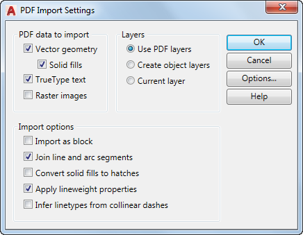 Sets the options for importing geometry, fills, raster images, and TrueType text objects from a specified PDF file.