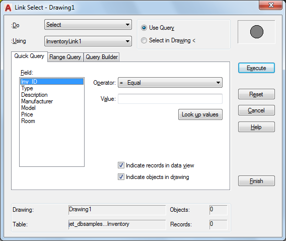 Executes the current Link Select query or temporarily dismisses the Link Select dialog box so you can select graphical objects from the drawing. If the Use Query option is selected, the Execute button is displayed. If the Select in Drawing option is selected, the Select button is displayed. After choosing the Execute or Select button, you can apply more queries or select additional graphical objects to further refine your selection set.
