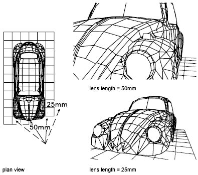 If perspective viewing is on, Zoom adjusts the camera lens length, which changes the field of view and causes more or less of the drawing to be visible at a given camera and target distance. The default lens length is 50mm, simulating what you'd see with a 35mm camera and a 50mm lens. Increasing the lens length is similar to switching to a telephoto lens. Decreasing the lens length widens the field of view, as with a wide-angle lens.