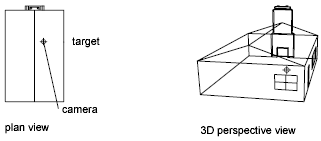 Moves the camera in or out along the line of sight relative to the target. This option turns on perspective viewing, which causes objects farther from the camera to appear smaller than those closer to the camera. A special perspective icon replaces the coordinate system icon. You are prompted for the new camera-to-target distance.
