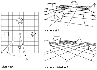 Specifies a new position for the target by rotating it around the camera. The effect is like turning your head to see different parts of the drawing from one vantage point. Two angles determine the amount of rotation.