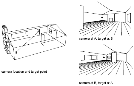 A rubber-band line connects the target point to the crosshairs to help you place the camera relative to the target. The illustration shows the change in view as you swap the camera and target points. Lens and distance settings are the same in each case.
