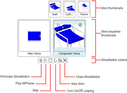 ShowMotion is made up of three main parts: shot thumbnails, shot sequence thumbnails, and the ShowMotion control. With the ShowMotion control, along the bottom, you can play the animations assigned to a shot, pin and unpin ShowMotion, and close ShowMotion. Use the shot and shot sequence thumbnails to navigate the shots in the current model.