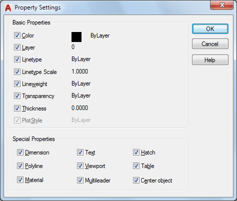 In addition to basic object properties, changes the hatch properties (including its annotative properties) of the destination object to that of the source object. To match the hatch origin, use Inherit Properties in HATCH or HATCHEDIT. Available only for hatch objects.