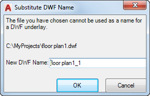 The names of DWF or DWFx references you attach must be unique. Attempts to attach two DWF or DWFx references that have the same name displays the Substitute DWF Name dialog box.